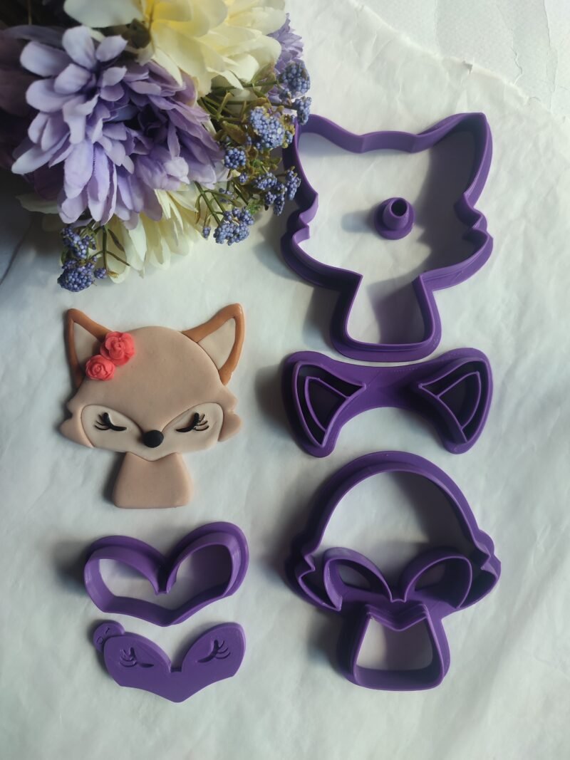 To Animal face – Fox αποτελείται από 5 cutters (κουπάτ) και μία ανάποδη σφραγίδα (debosser). Αρχικό μέγεθος 88x73mm.