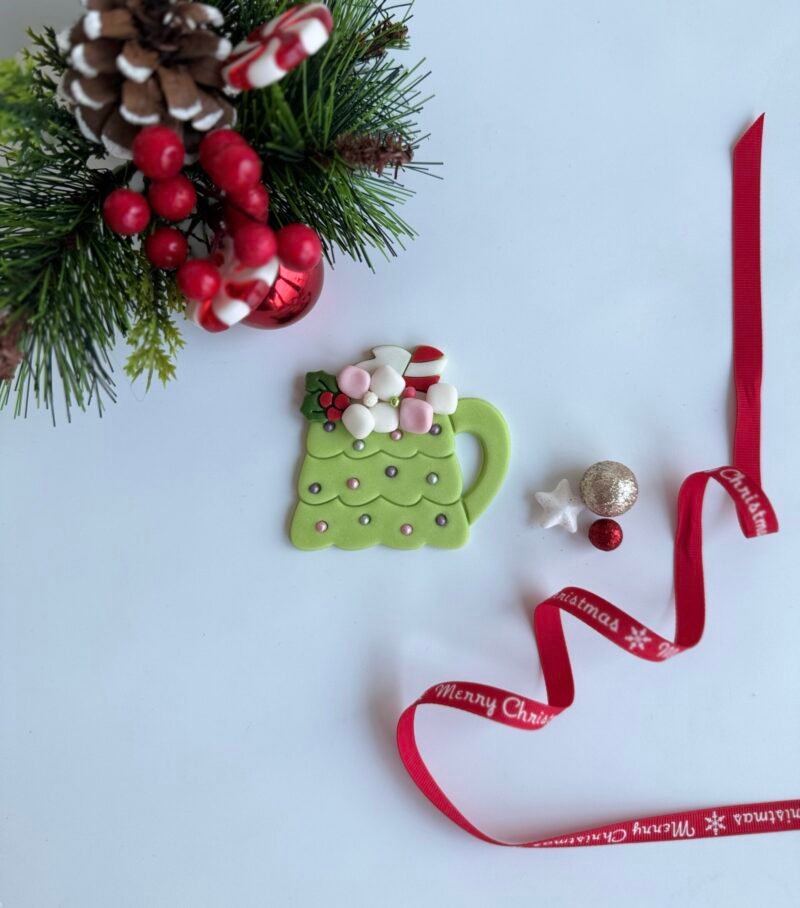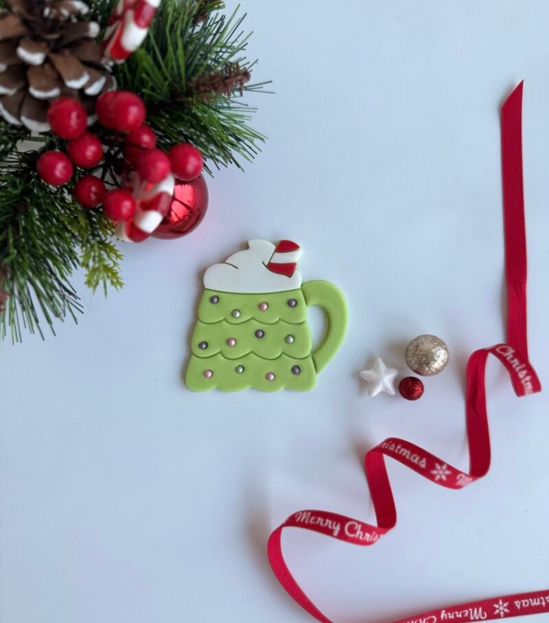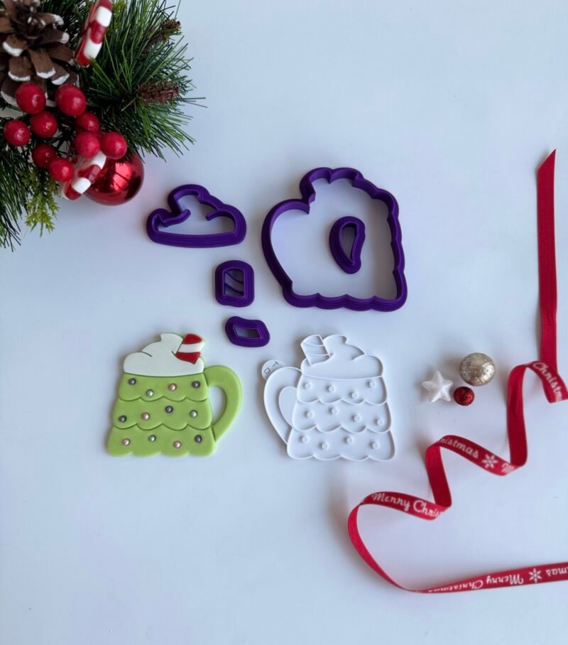 To Christmas tree mug αποτελείται από 5 cutters (κουπάτ) και μία κανονική σφραγίδα (embosser). Αρχικό μέγεθος 78x74mm.