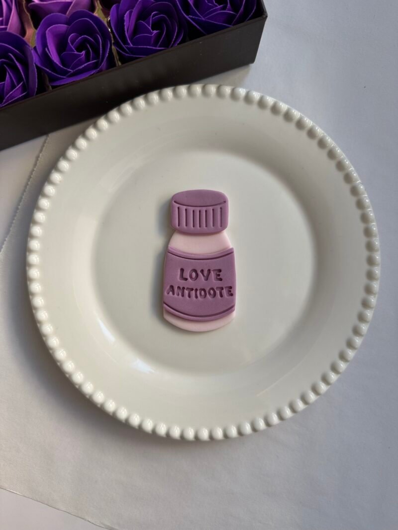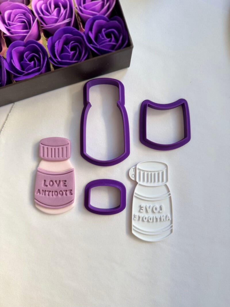 Το Love antidote αποτελείται από 3 cutters (κουπάτ) και μία κανονική σφραγίδα (embosser). Αρχικό μέγεθος 80x40mm.