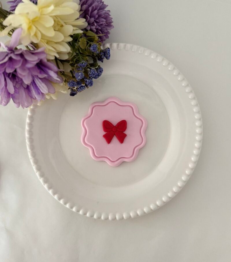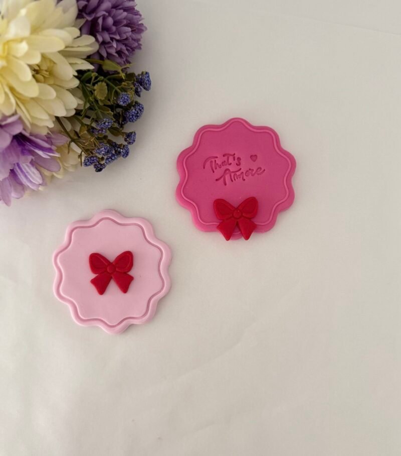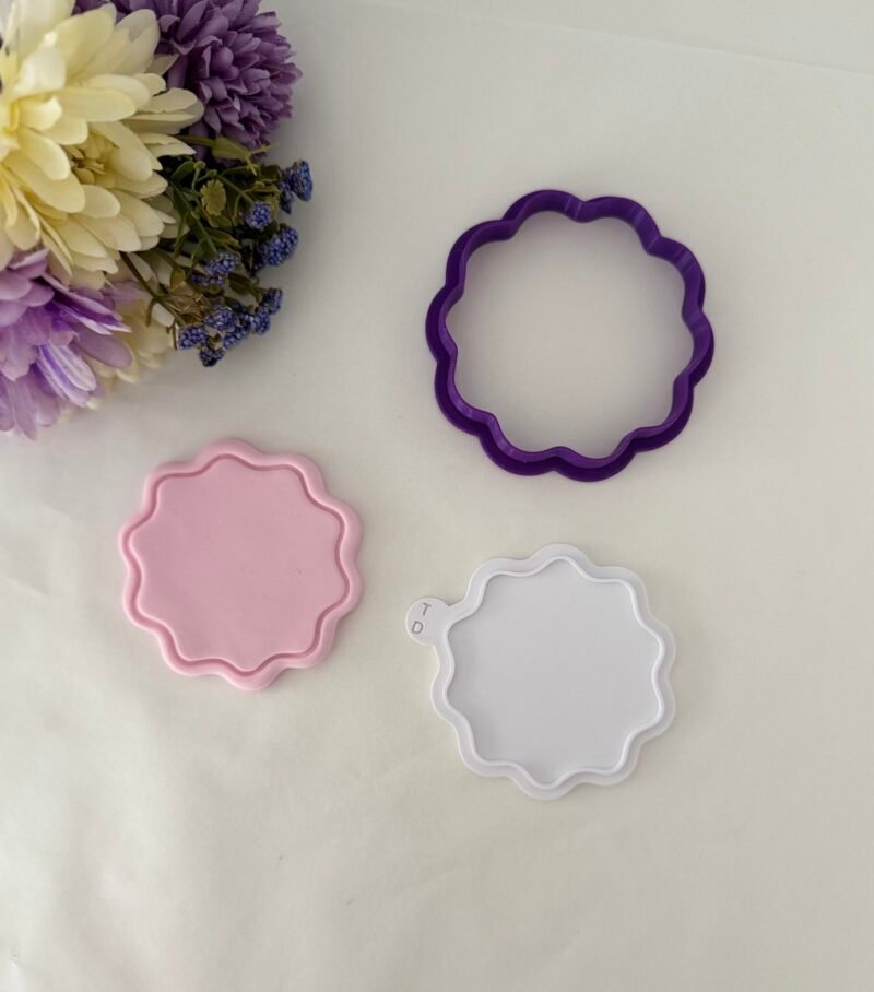 Το Wavy circle frame embosser αποτελείται από 1 cutter (κουπάτ) και 1 κανονική σφραγίδα (embosser). Αρχικό μέγεθος 78x76mm.