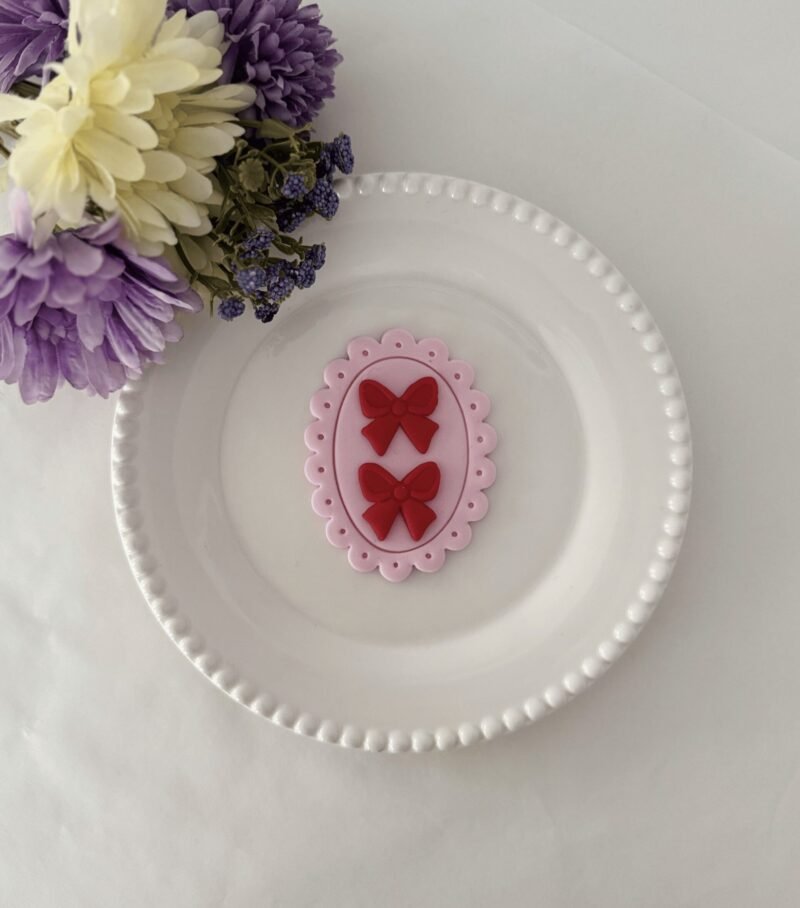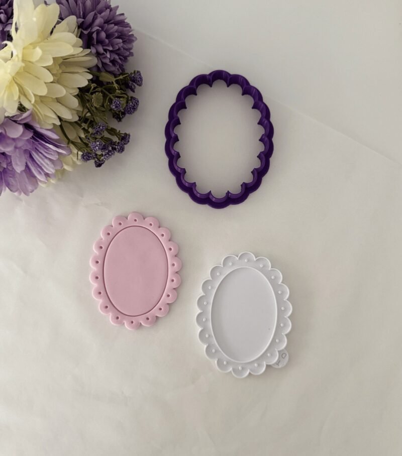 Το Wavy oval frame with line and dots αποτελείται από 1 cutter (κουπάτ) και 1 κανονική σφραγίδα (embosser). Αρχικό μέγεθος 88x67mm.