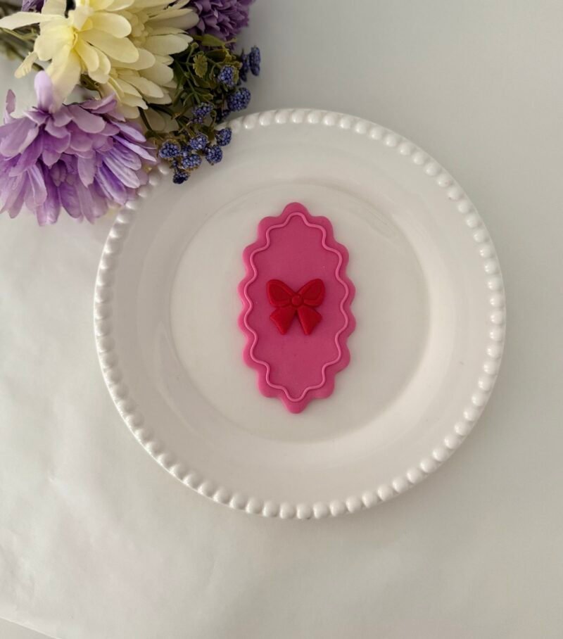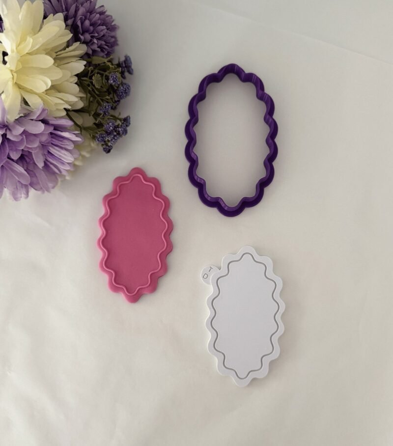 Το Wavy slim oval debosser αποτελείται από 1 cutter (κουπάτ) και 1 ανάποδη σφραγίδα (debosser). Αρχικό μέγεθος 103x58mm.